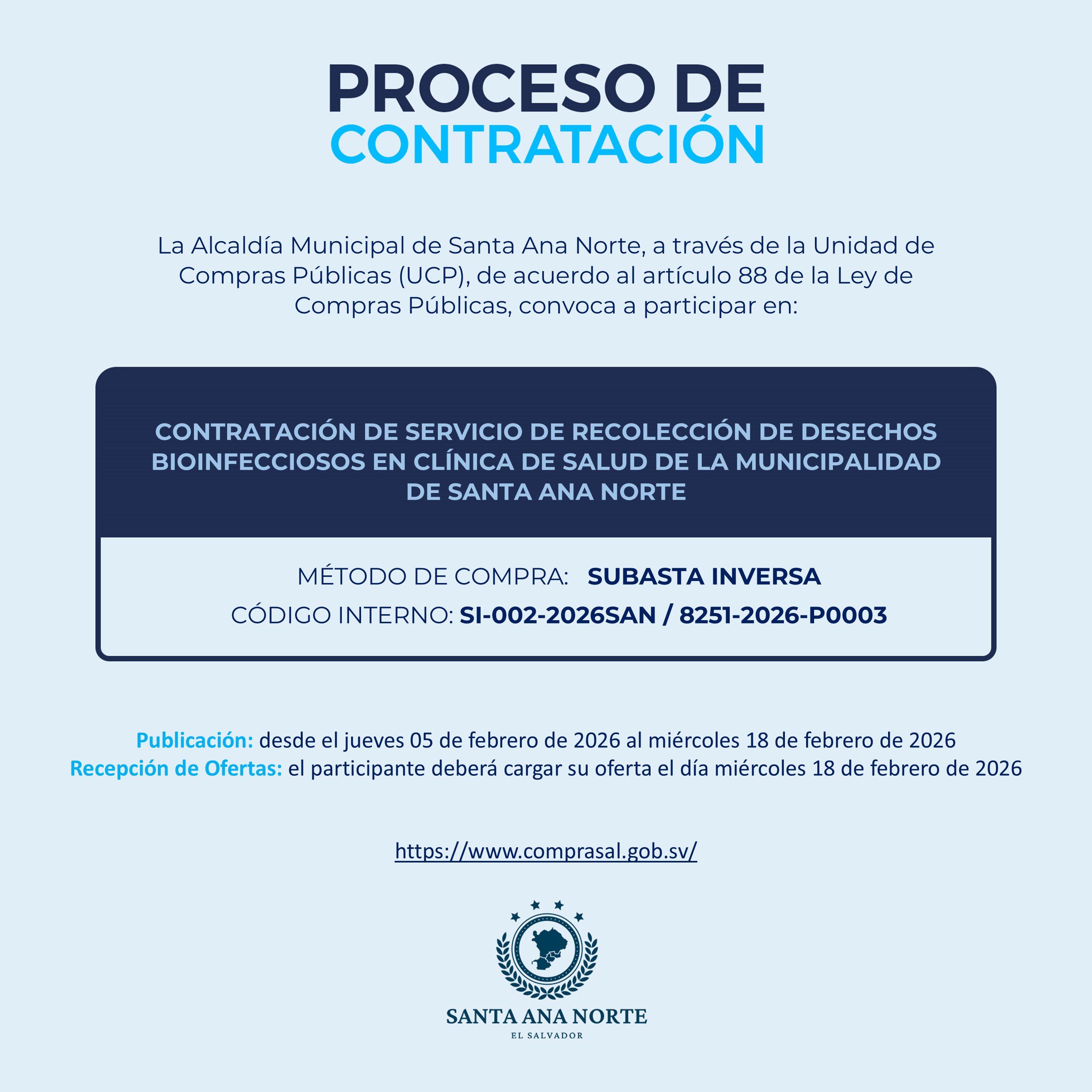 CONTRATACIÓN DE SERVICIO DE RECOLECCIÓN DE DESECHOS BIOINFECCIOSOS EN CLÍNICA DE SALUD DE LA MUNICIPALIDAD DE SANTA ANA NORTE