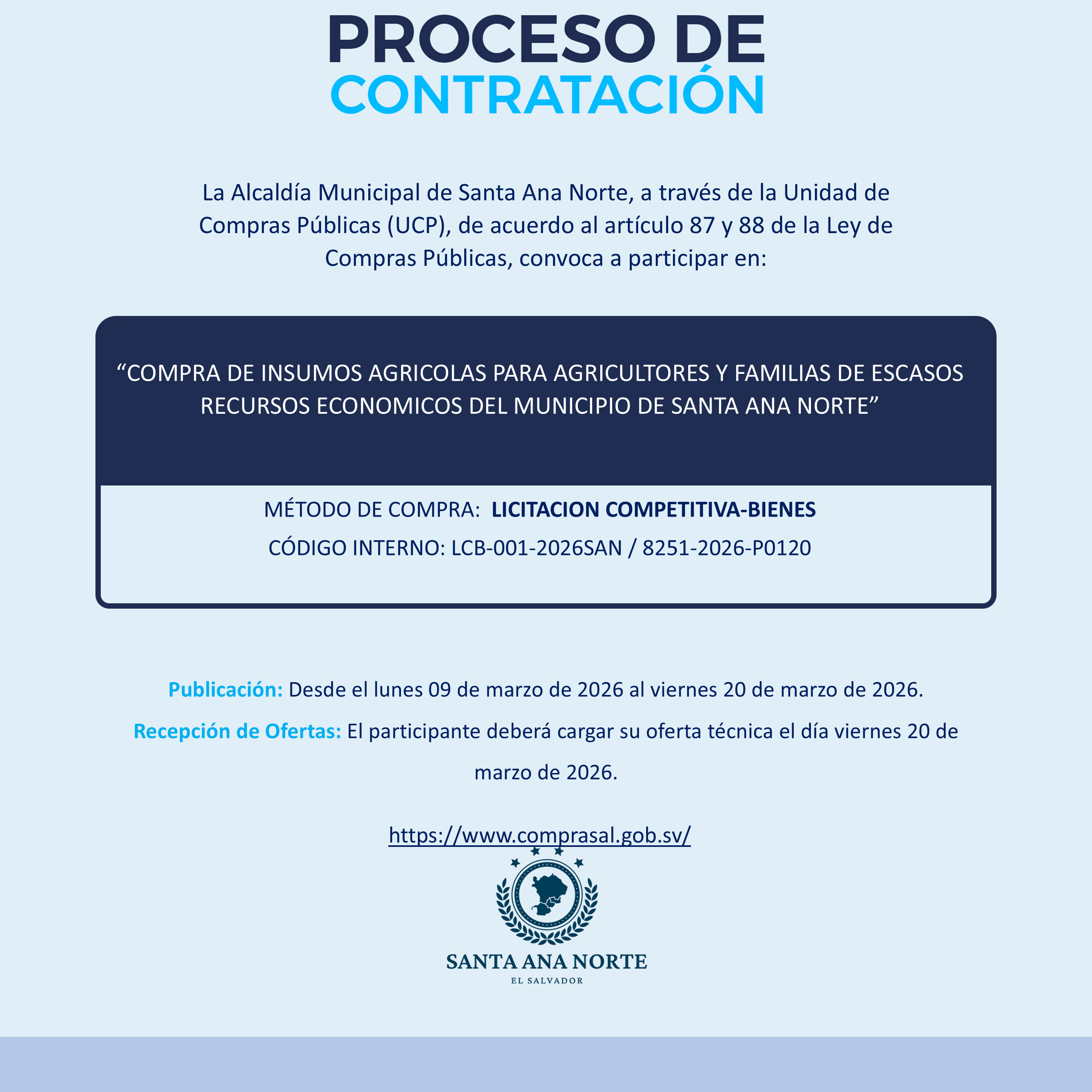 COMPRA DE INUSMOS AGRICOLA PARA AGRICULTORES Y FAMILIAS DE ESCASOS RECURSOS ECONOMICOS DEL MUNICIPIO DE SANTA ANA NORTE 2026