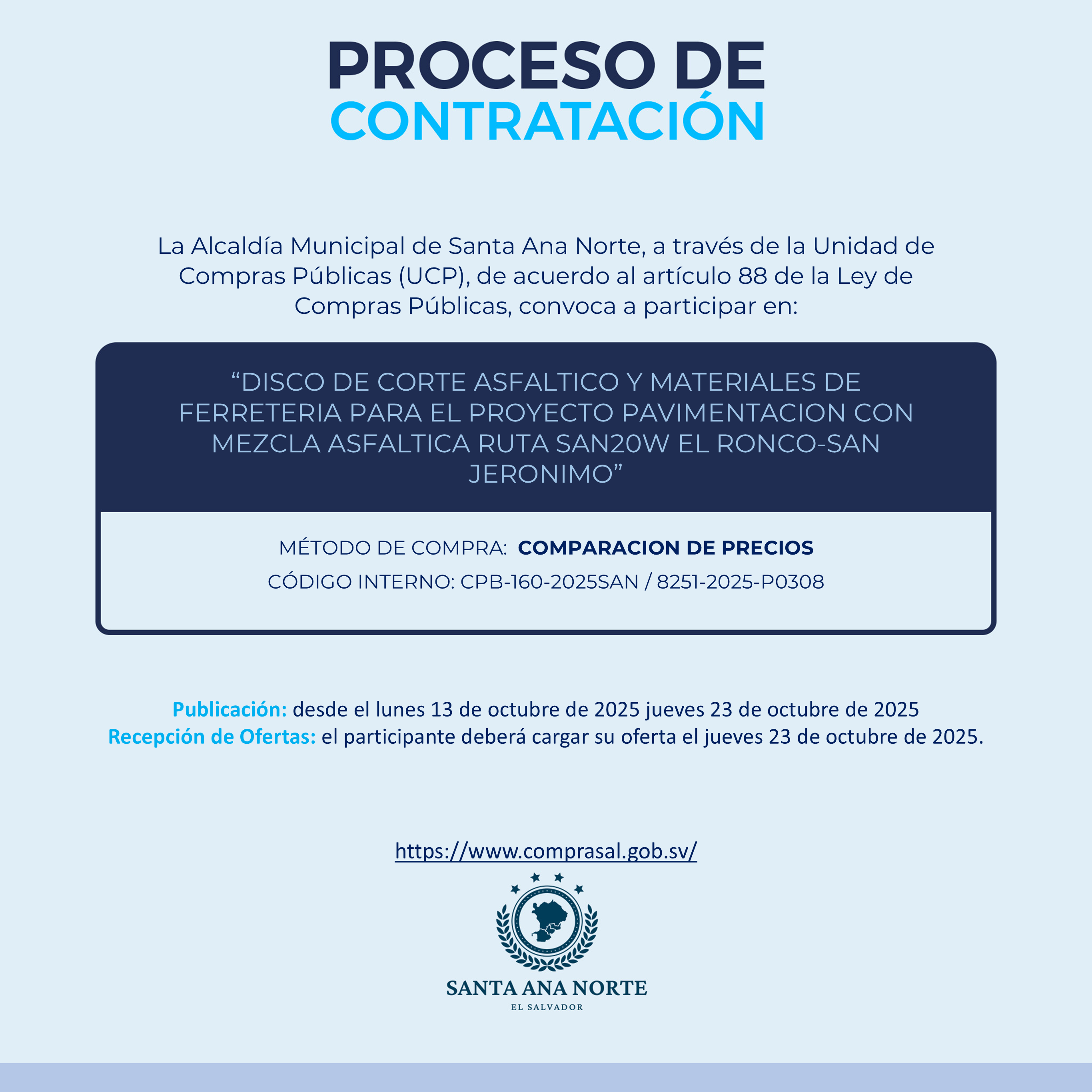 DISCO DE CORTE ASFALTICO Y MATERIALES DE FERRETERIA PARA EL PROYECTO PAVIMENTACION CON MEZCLA ASFALTICA RUTA SAN20W EL RONCO-SAN JERONIMO